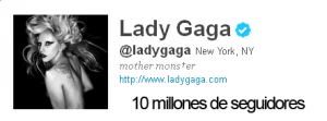 La cantante estadunidense Lady Gaga, el 14 de mayo del 2011, logro la estrambótica cifra de 10 millones de seguidores en la red de microblogging Twitter.